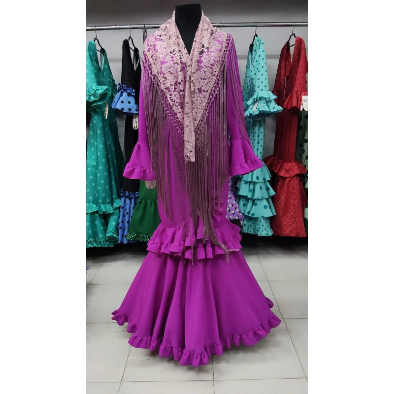 TRAJE CORTADO AL TALLE, TEJIDO POPELIN DE LICRA Y TEJIDO ENCAJE, ESCOTE DELANTERO DE HOJA Y EL TRESERO REDONDO A MEDIA ESPALDA, DEBAJO LLEVA CANCAN PARA REALZAR EL VUELO, MUY COMODO Y DE POCO PESO. ENTREGA INMEDIATA